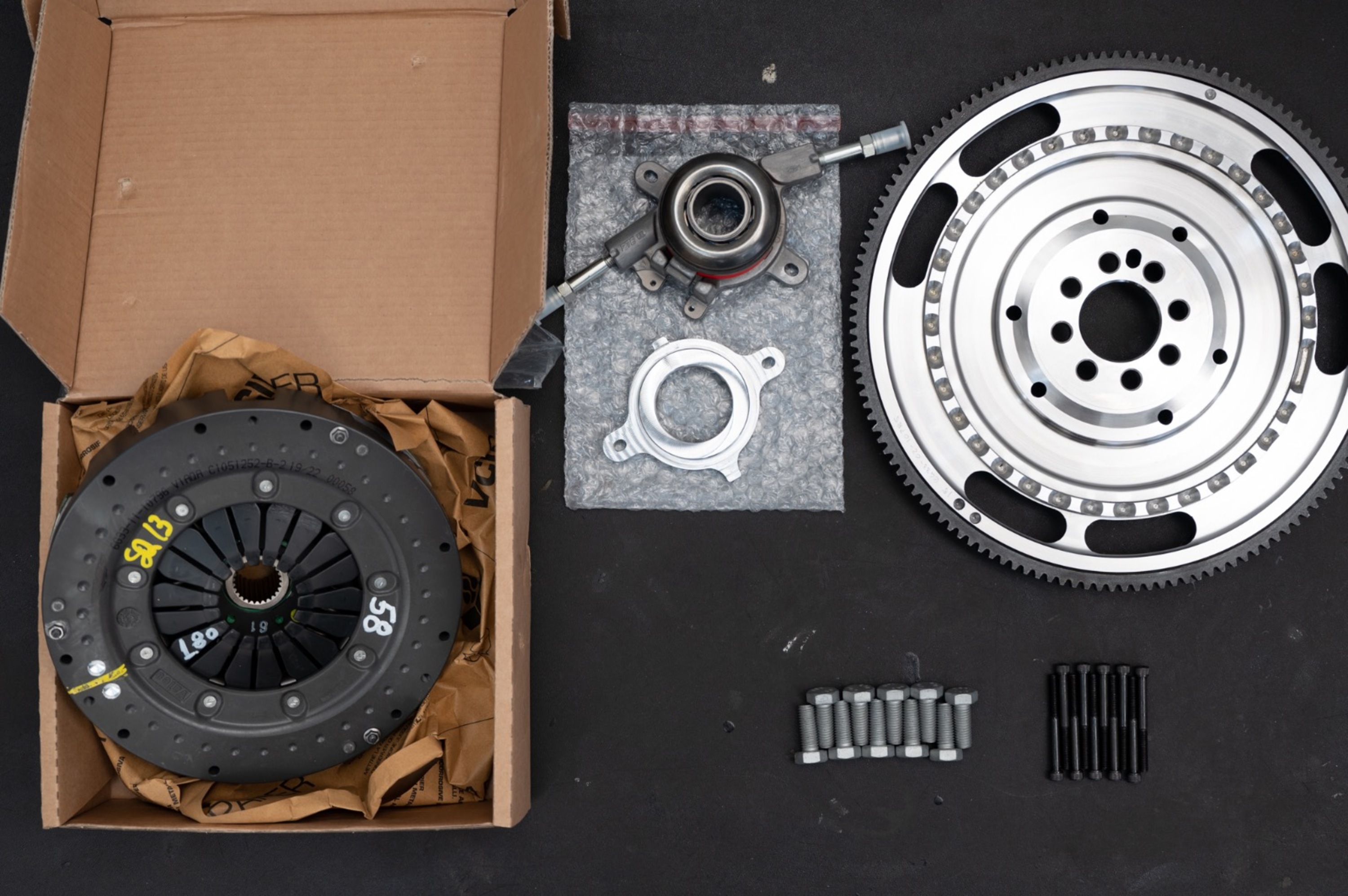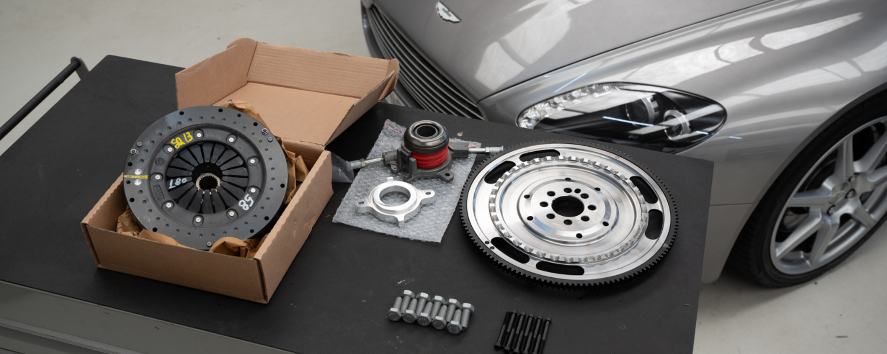 Our genuine AMR twin plate clutch upgrade is highly sought after among V8 Vantage owners looking for peace of mind as well as an enhanced driving experience. The twin plate clutch better stands up to wear and also results in a lighter clutch pedal feel, with the lightweight flywheel delivering a quicker revving engine and a more precise gear change. Gaining access to the clutch is a lengthy procedure that requires the removal of the exhaust system, left exhaust manifold, gearbox, torque tube and prop shaft. In total we plan for two days in the workshop for fitment of this very popular upgrade.