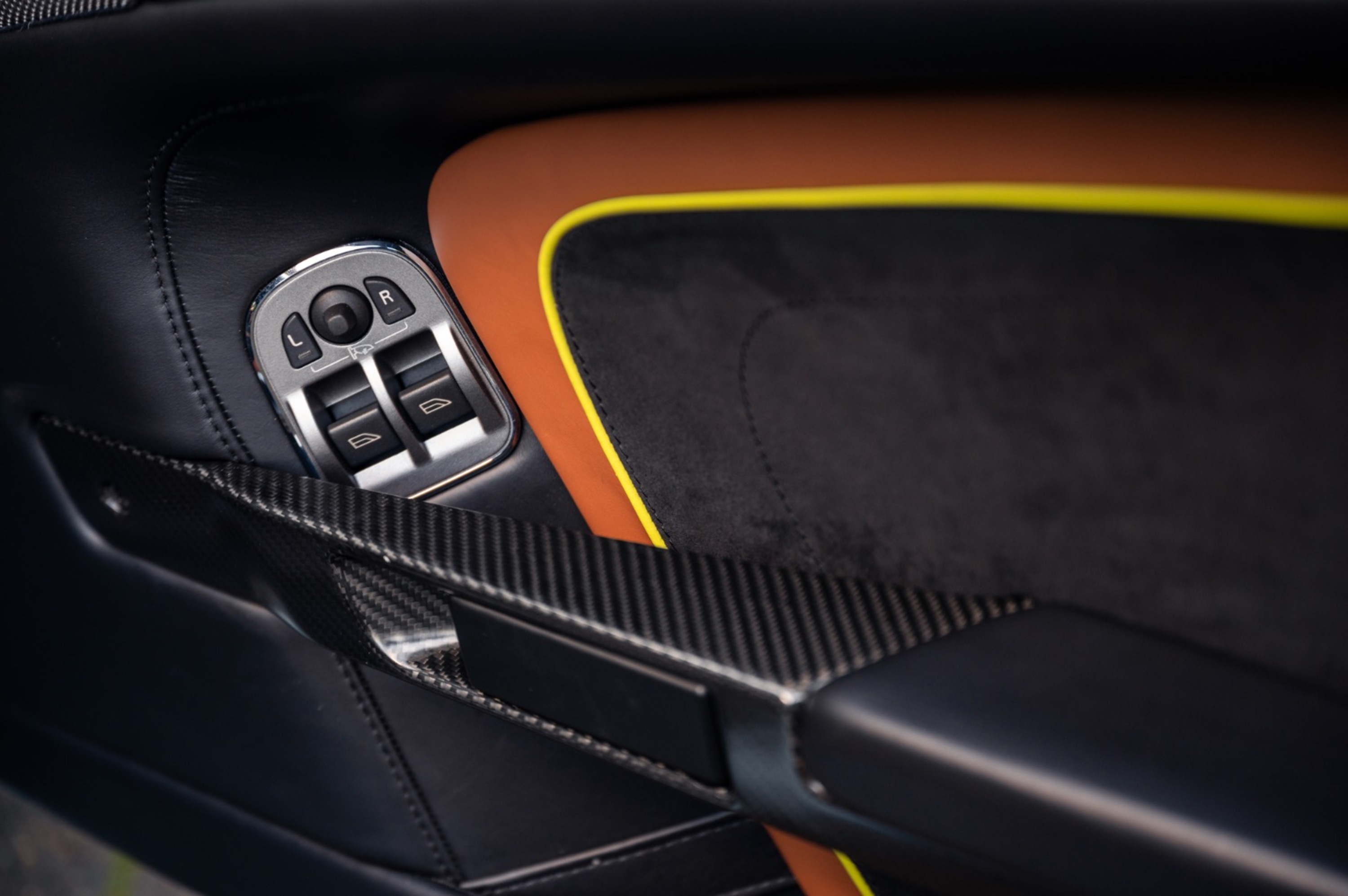 - Two-tone Copper Tan leather/Black Alcantara